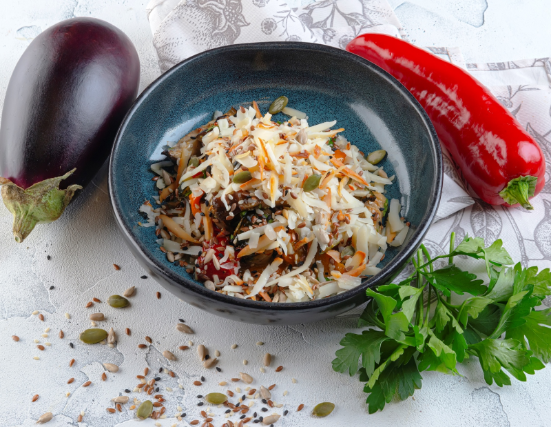 Запеченные на гриле баклажаны, цукини, болгарский перец, копченый сыр сулугуни с орехово-кунжутной заправкой и миксом семян